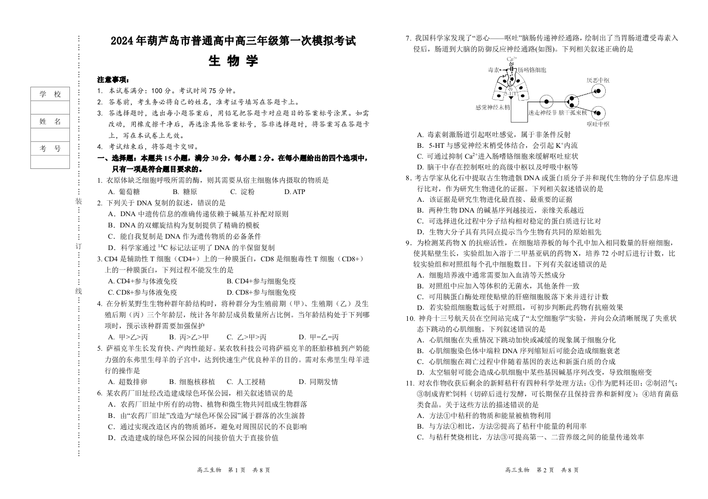 辽宁省葫芦岛市2024年普通高中高三年级下学期第一次模拟考试生物