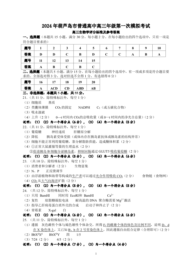 辽宁省葫芦岛市2024年普通高中高三年级下学期第一次模拟考试生物答案