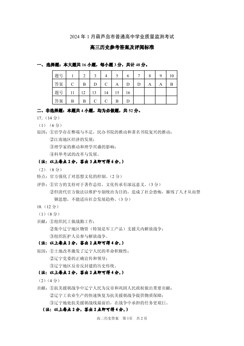辽宁省葫芦岛市2024年普通高中高三年级下学期第一次模拟考试历史答案