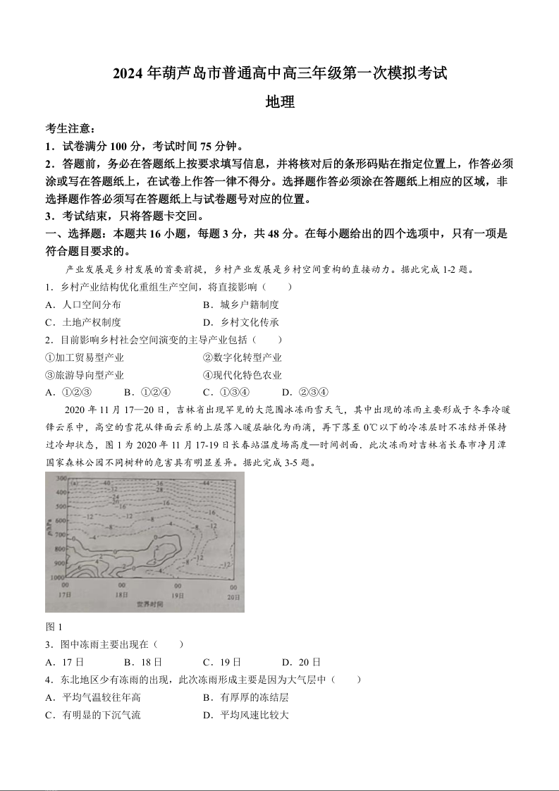 辽宁省葫芦岛市2024年普通高中高三年级下学期第一次模拟考试地理