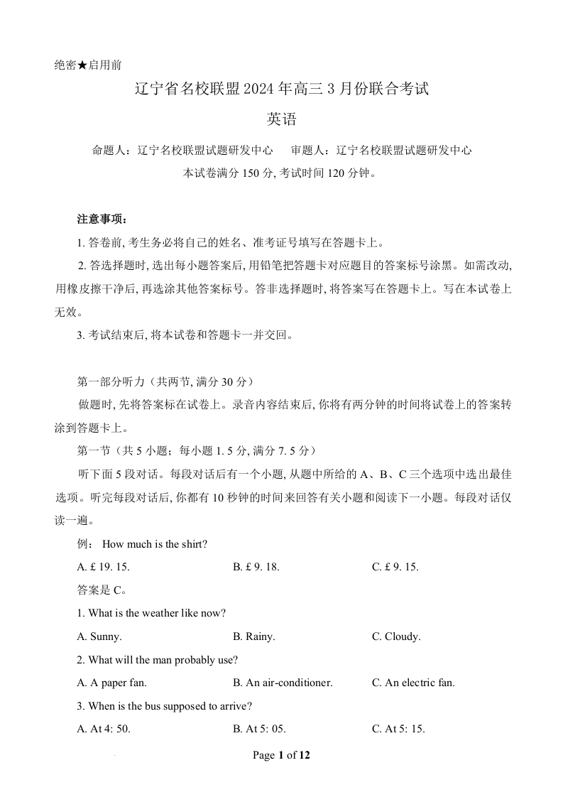 辽宁省名校联盟2024届高三下学期3月份联合考试英语