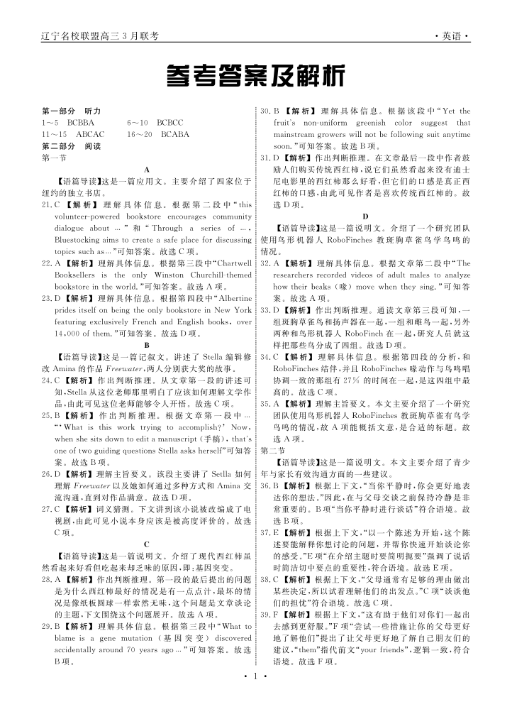 辽宁省名校联盟2024届高三下学期3月份联合考试英语答案