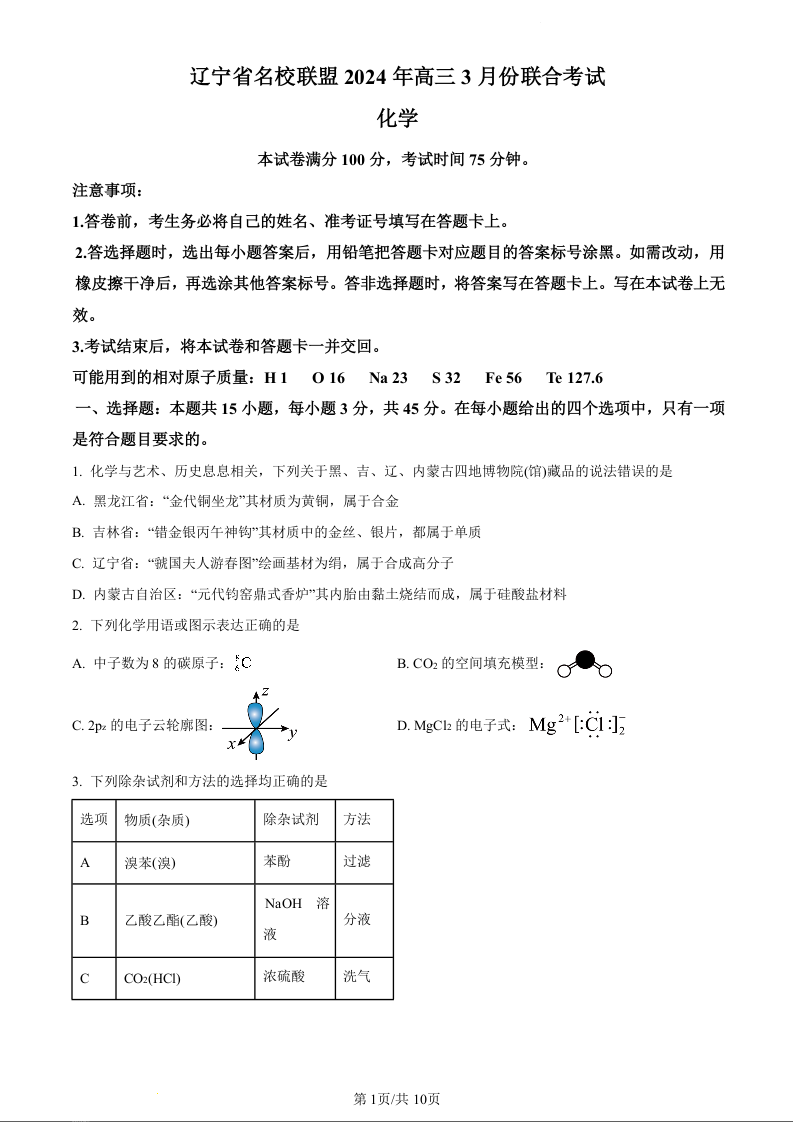 辽宁省名校联盟2024届高三下学期3月份联合考试化学(原卷版)
