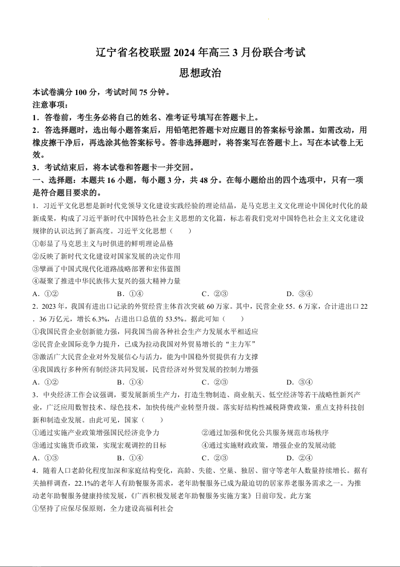 辽宁省名校联盟2024届高三下学期3月份联合考试政治