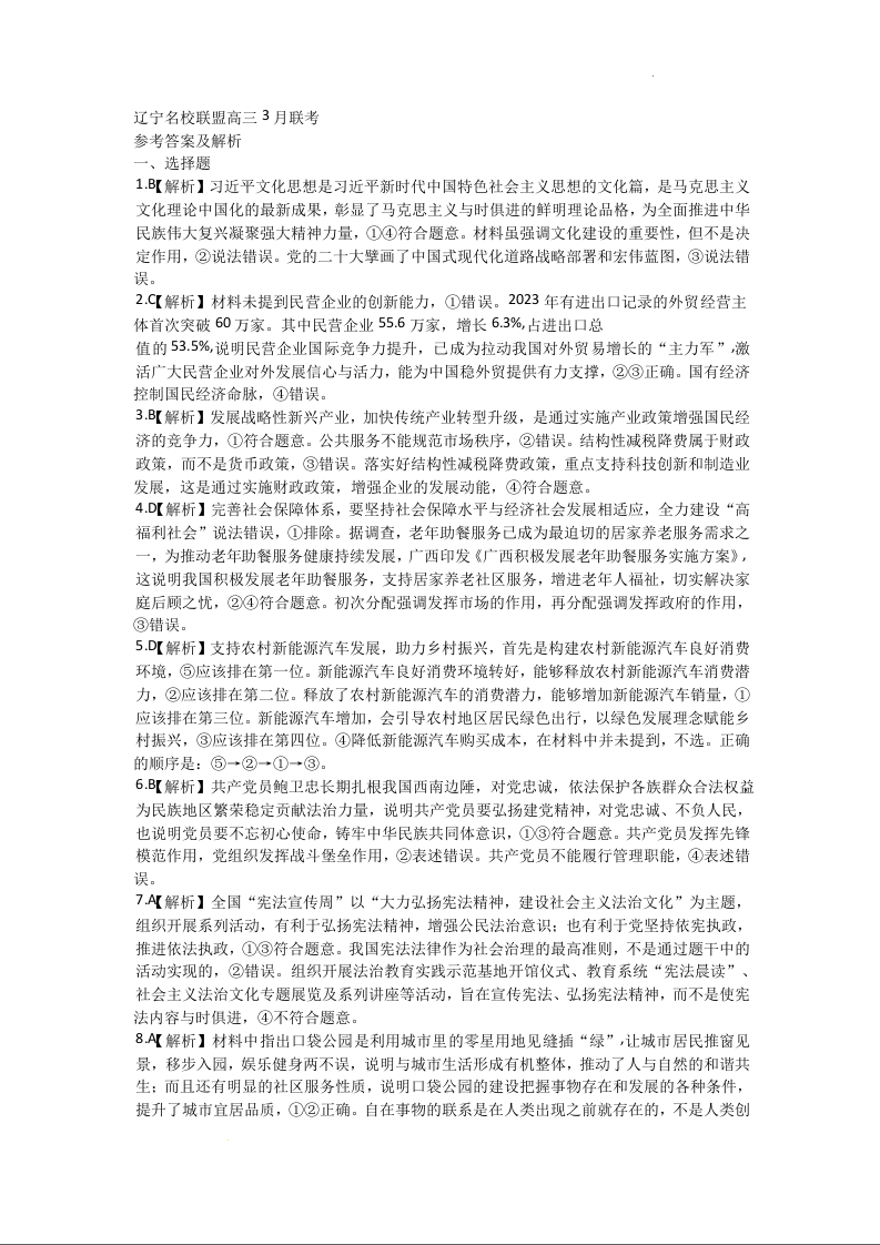 辽宁省名校联盟2024届高三下学期3月份联合考试政治答案