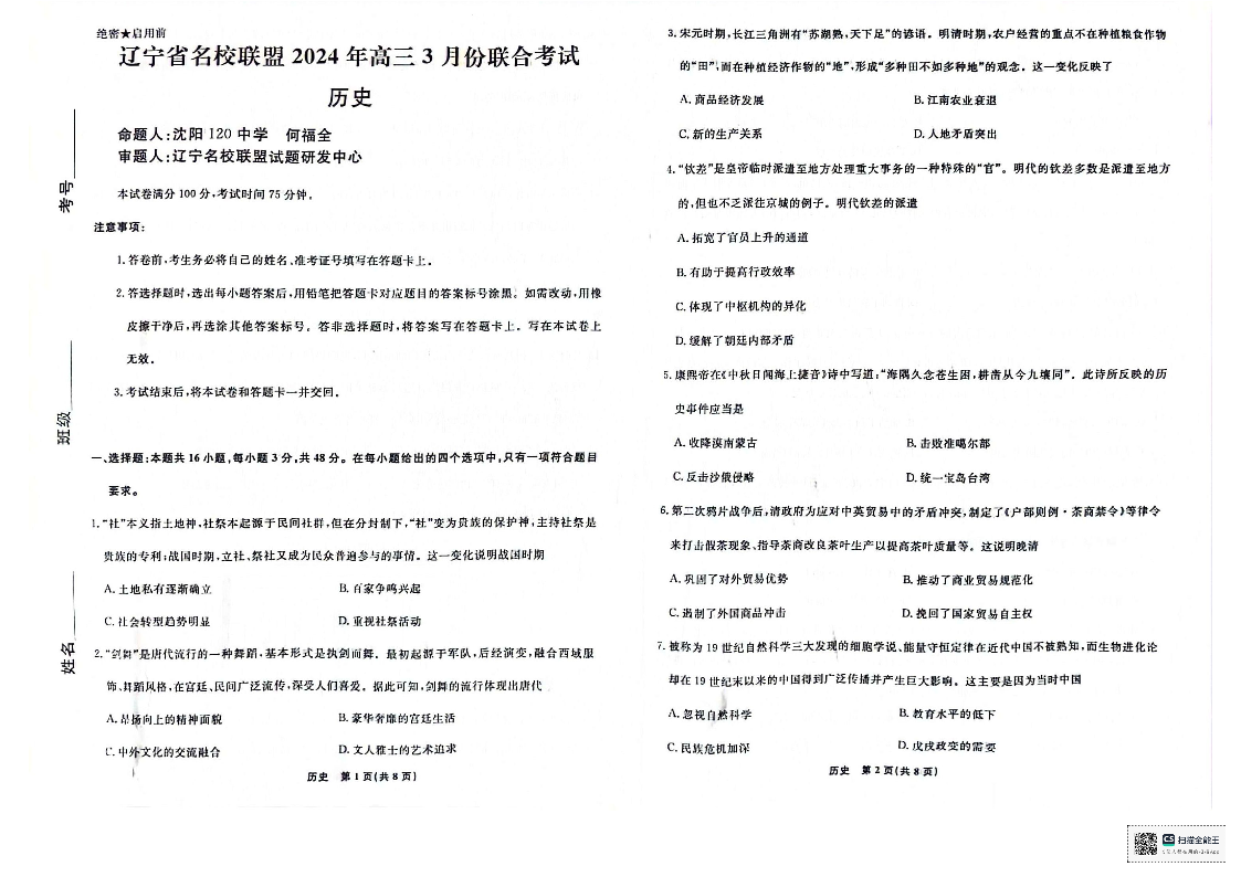 辽宁省名校联盟2024届高三下学期3月份联合考试历史