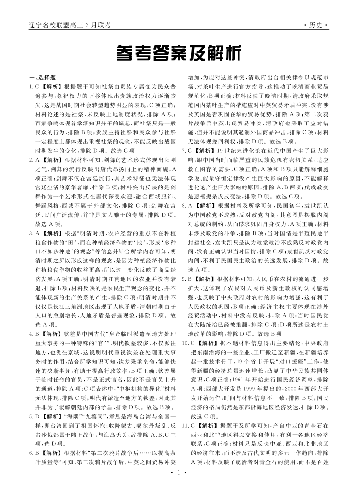 辽宁省名校联盟2024届高三下学期3月份联合考试历史答案