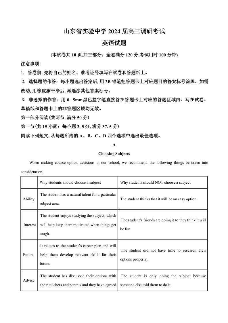 山东省实验中学2024届高三下学期2月调研考试英语+答案