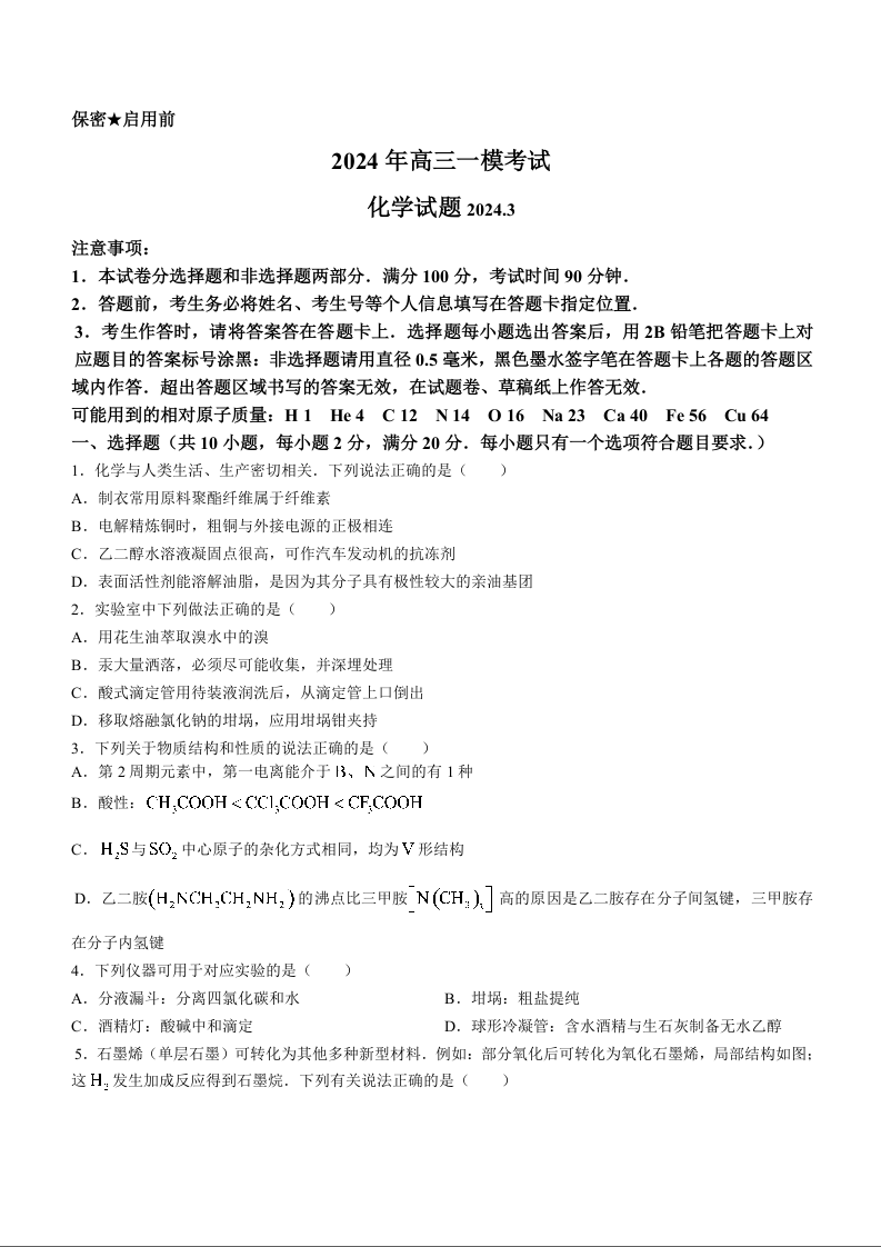 山东省菏泽市2024届高三一模考试化学