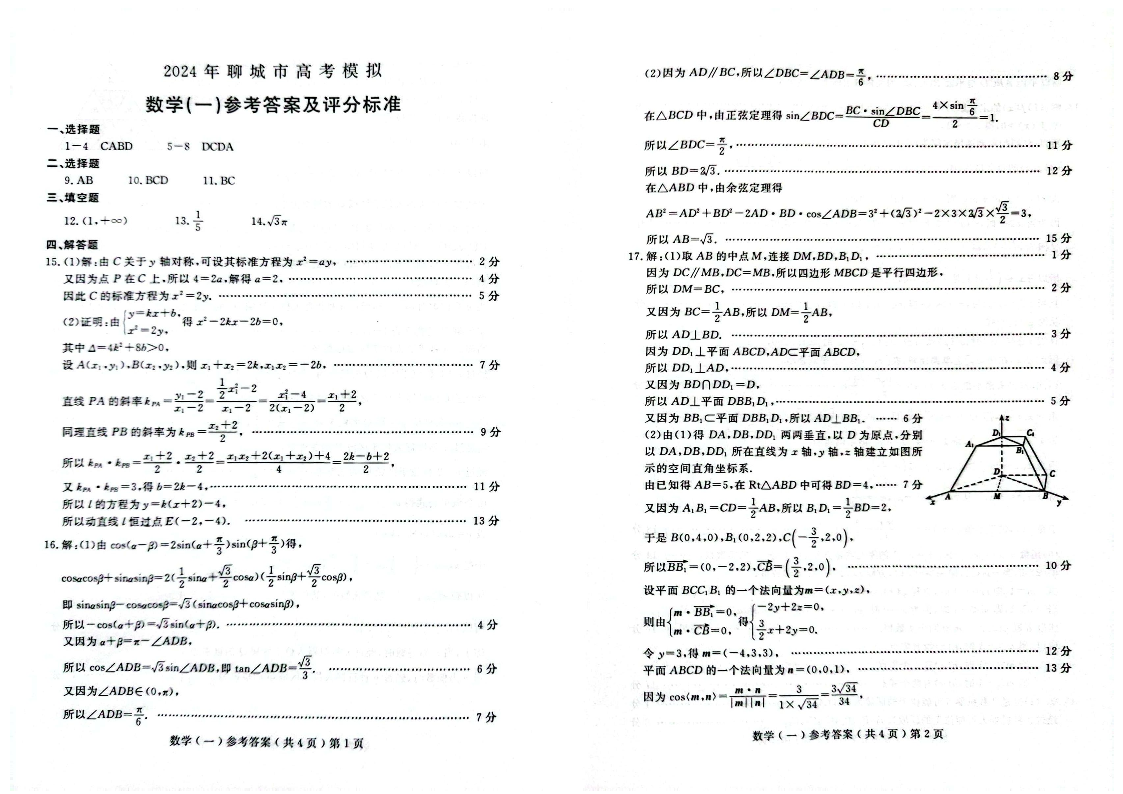 山东省聊城市2024年高考模拟试题(一)数学答案