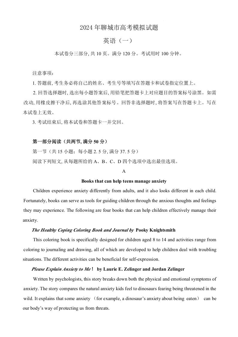山东省聊城市2024年高考模拟试题(一)英语+答案