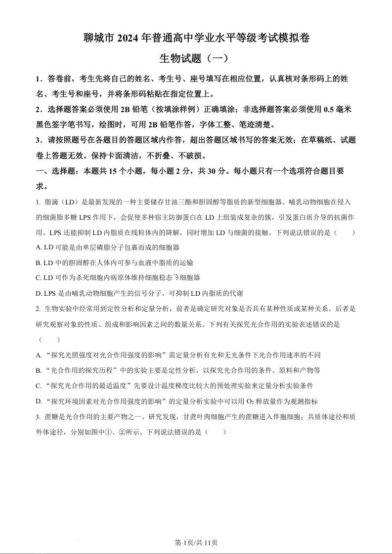 山东省聊城市2024年高考模拟试题(一)生物(原卷版)