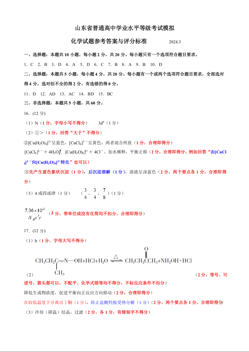 山东省临沂市2024届高三下学期3月一模考试化学答案