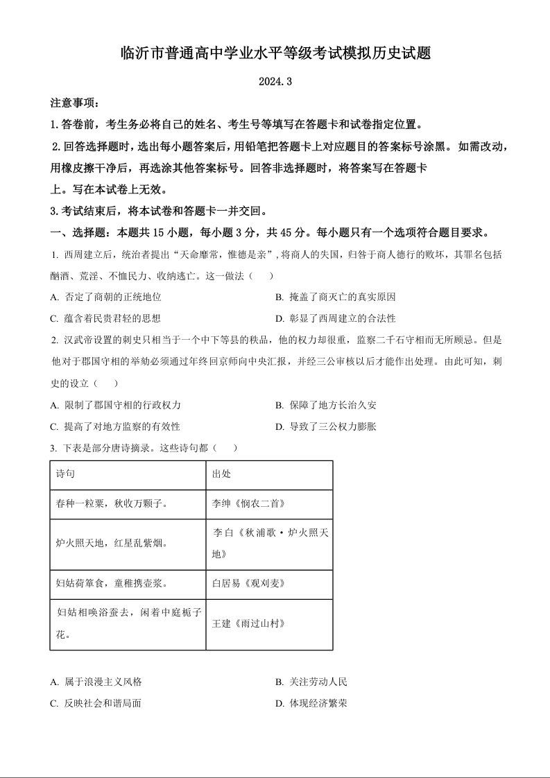 山东省临沂市2024届高三下学期3月一模考试历史+答案