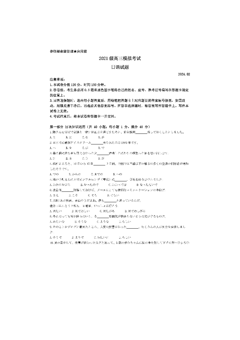 山东省日照市2024届校际联合考试高三一模(2月)日语