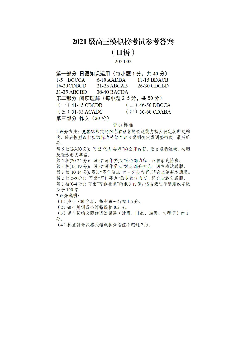 山东省日照市2024届校际联合考试高三一模(2月)日语答案