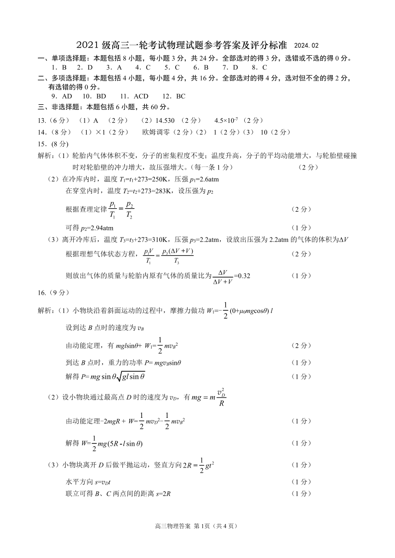 山东省日照市2024届校际联合考试高三一模(2月)物理答案