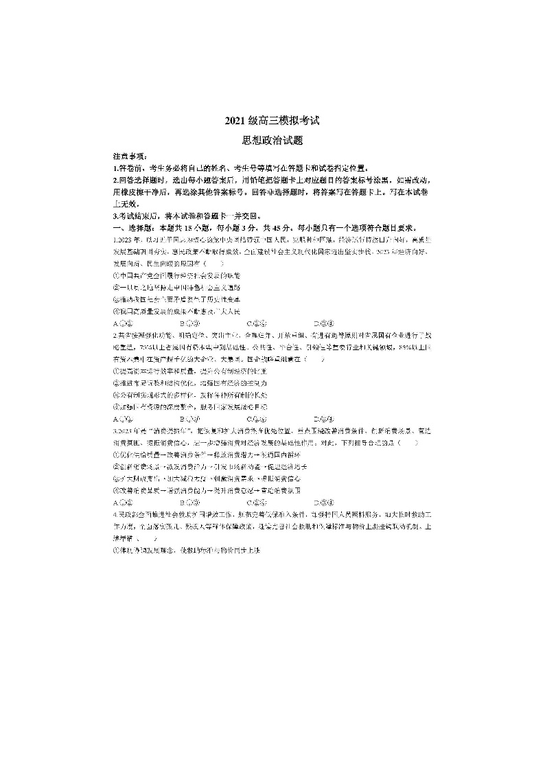 山东省日照市2024届校际联合考试高三一模(2月)政治