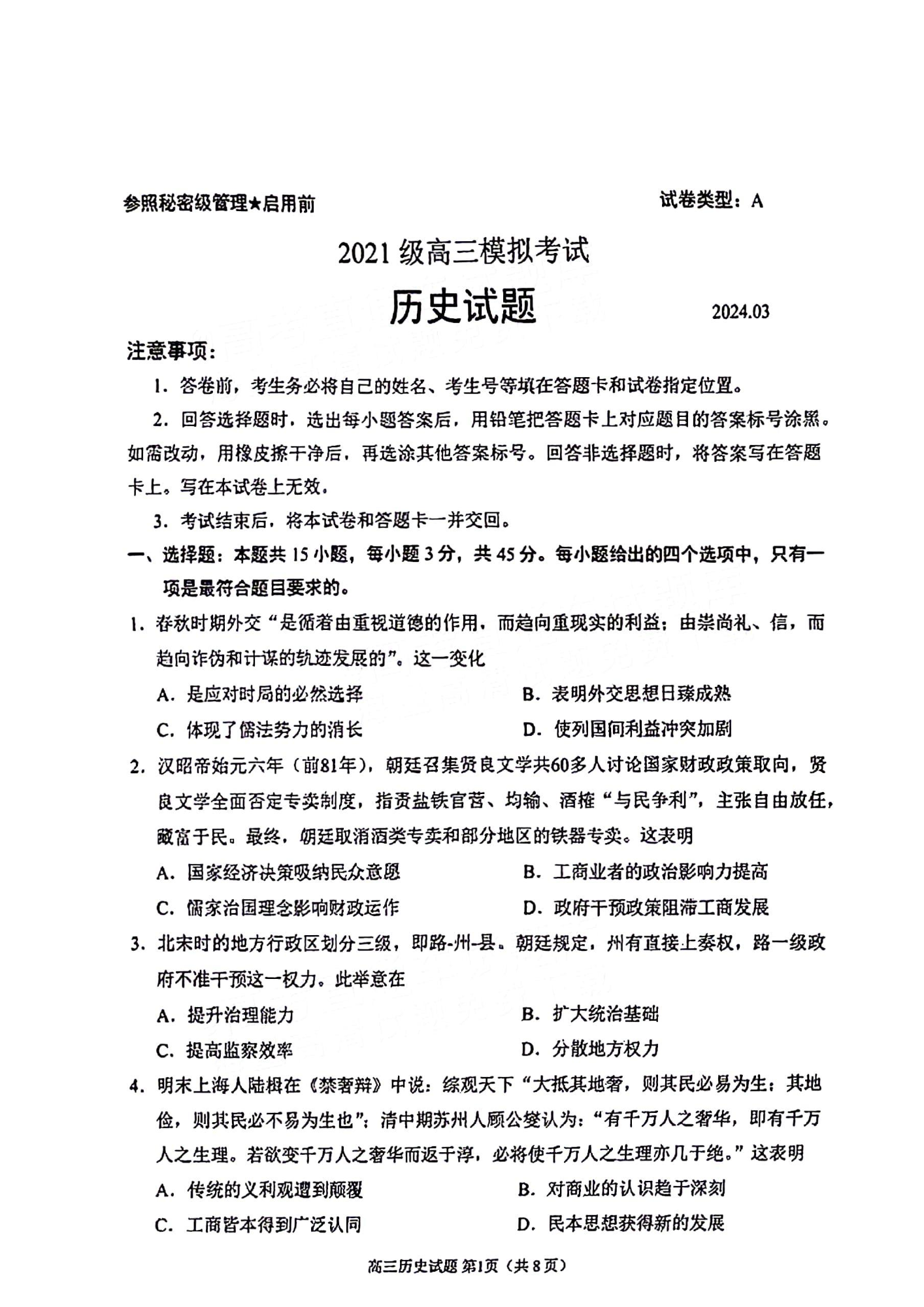 山东省日照市2024届校际联合考试高三一模(2月)历史