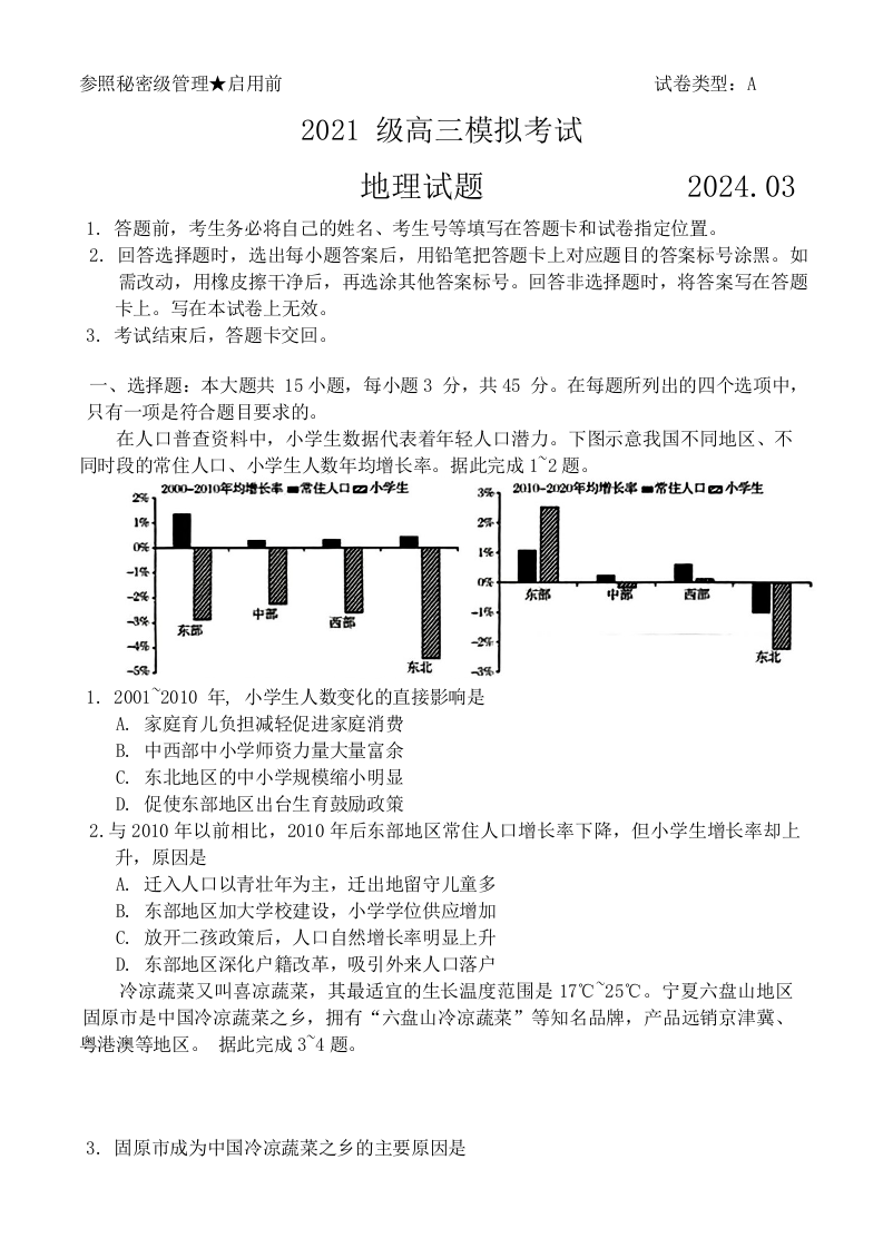 山东省日照市2024届校际联合考试高三一模(2月)地理