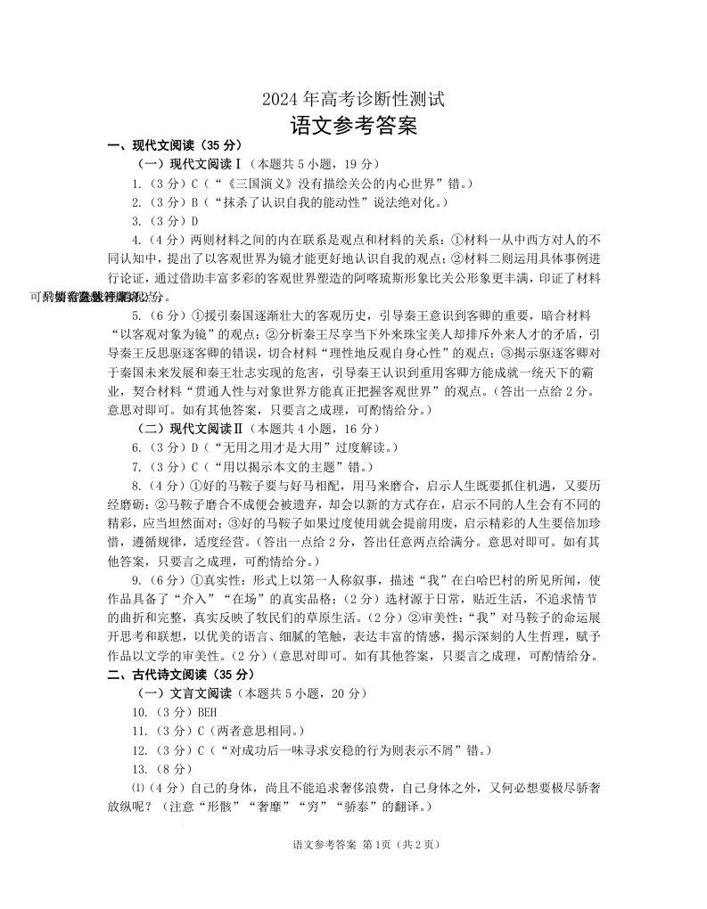 山东省烟台德州东营2024年高考诊断性测试(一模)语文答案
