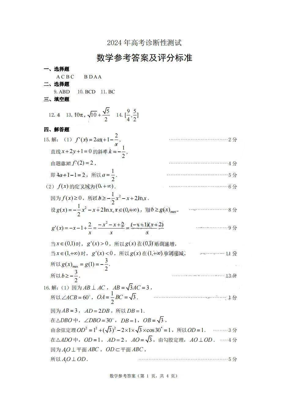 山东省烟台德州东营2024年高考诊断性测试(一模)数学答案