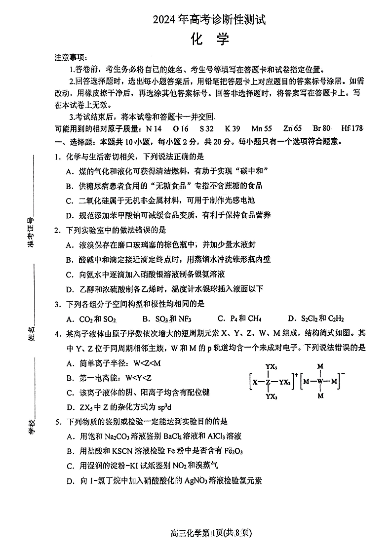 山东省烟台德州东营2024年高考诊断性测试(一模)化学