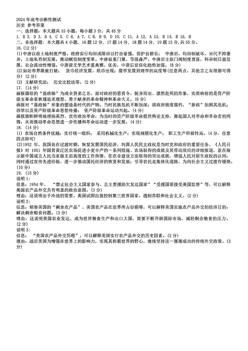 山东省烟台德州东营2024年高考诊断性测试(一模)历史答案