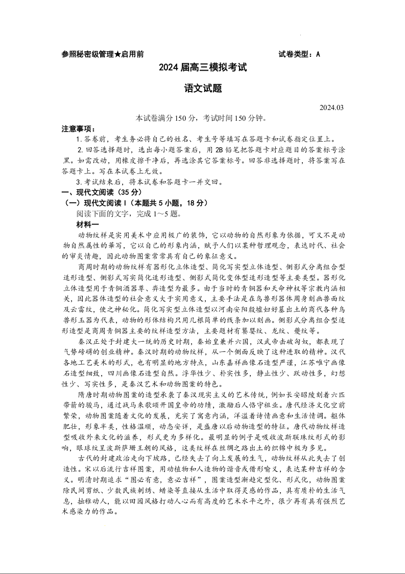 山东省枣庄市2024届高三下学期3月模拟考试(枣庄二模)语文+答案