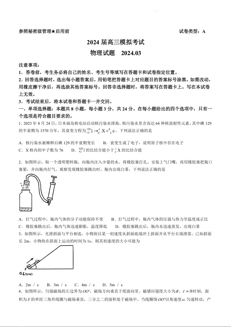 山东省枣庄市2024届高三下学期3月模拟考试(枣庄二模)物理
