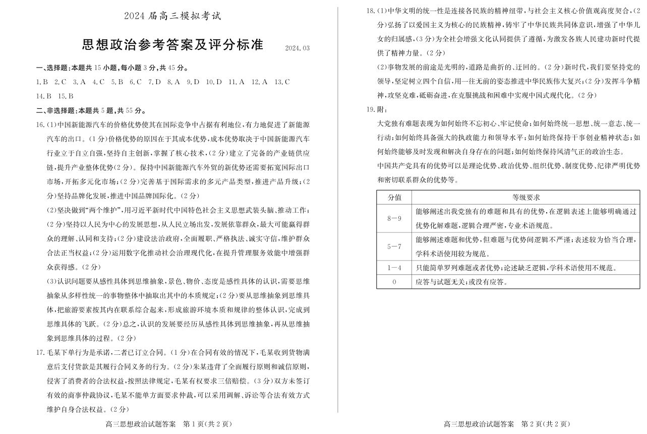 山东省枣庄市2024届高三下学期3月模拟考试(枣庄二模)政治答案