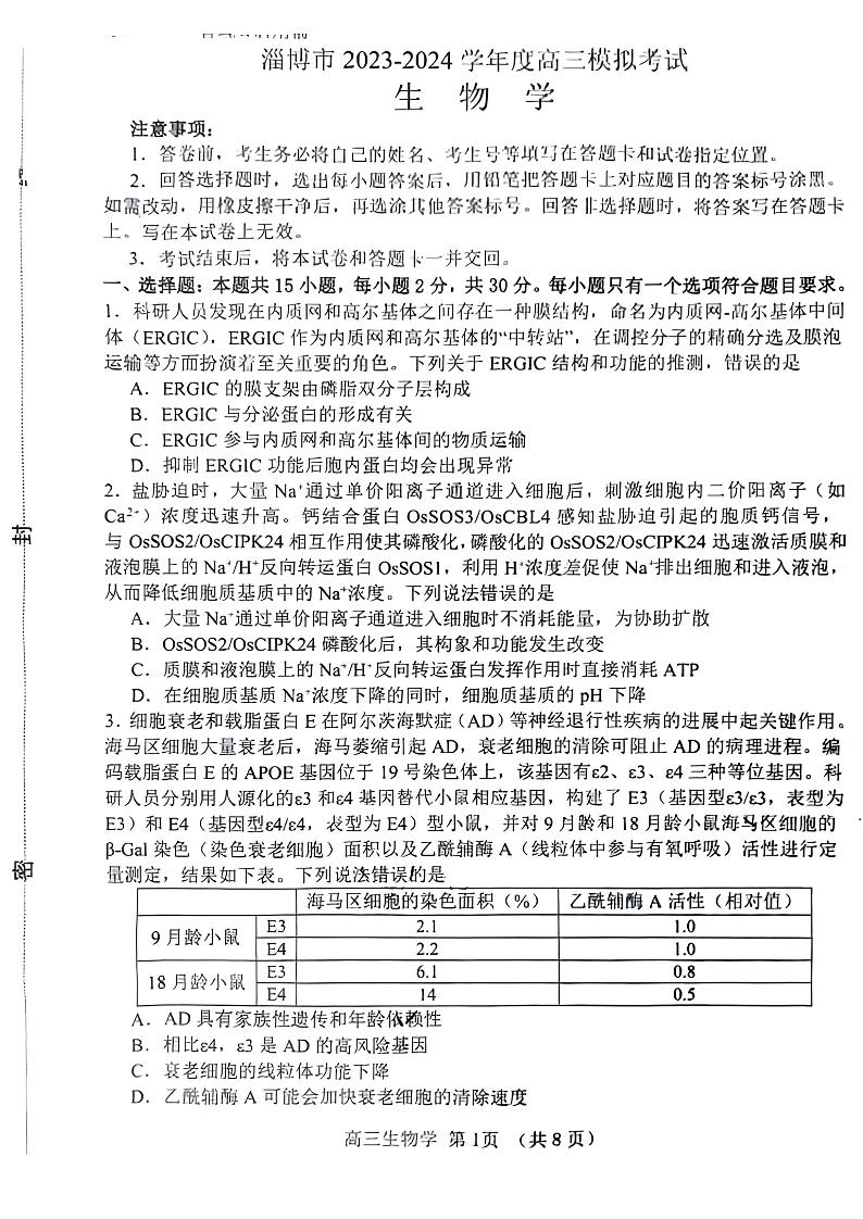 山东省淄博市2024届高三下学期一模考试生物