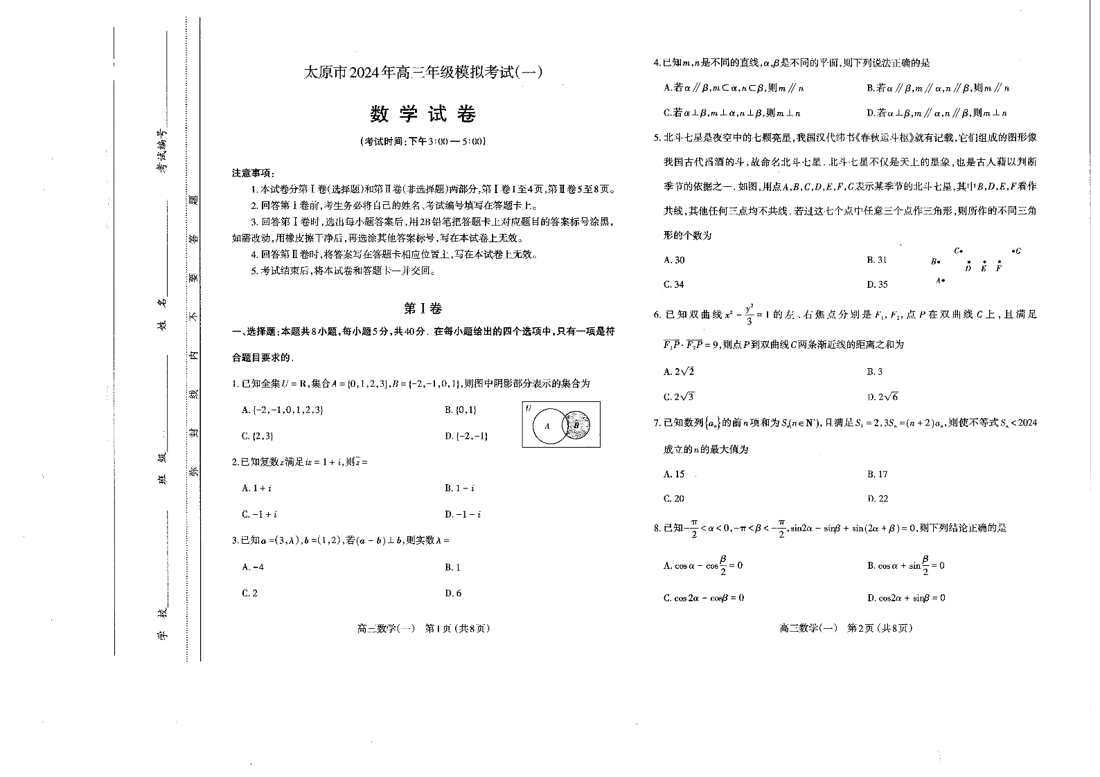 山西省太原市2024届高三下学期模拟考试(一)(太原一模)数学