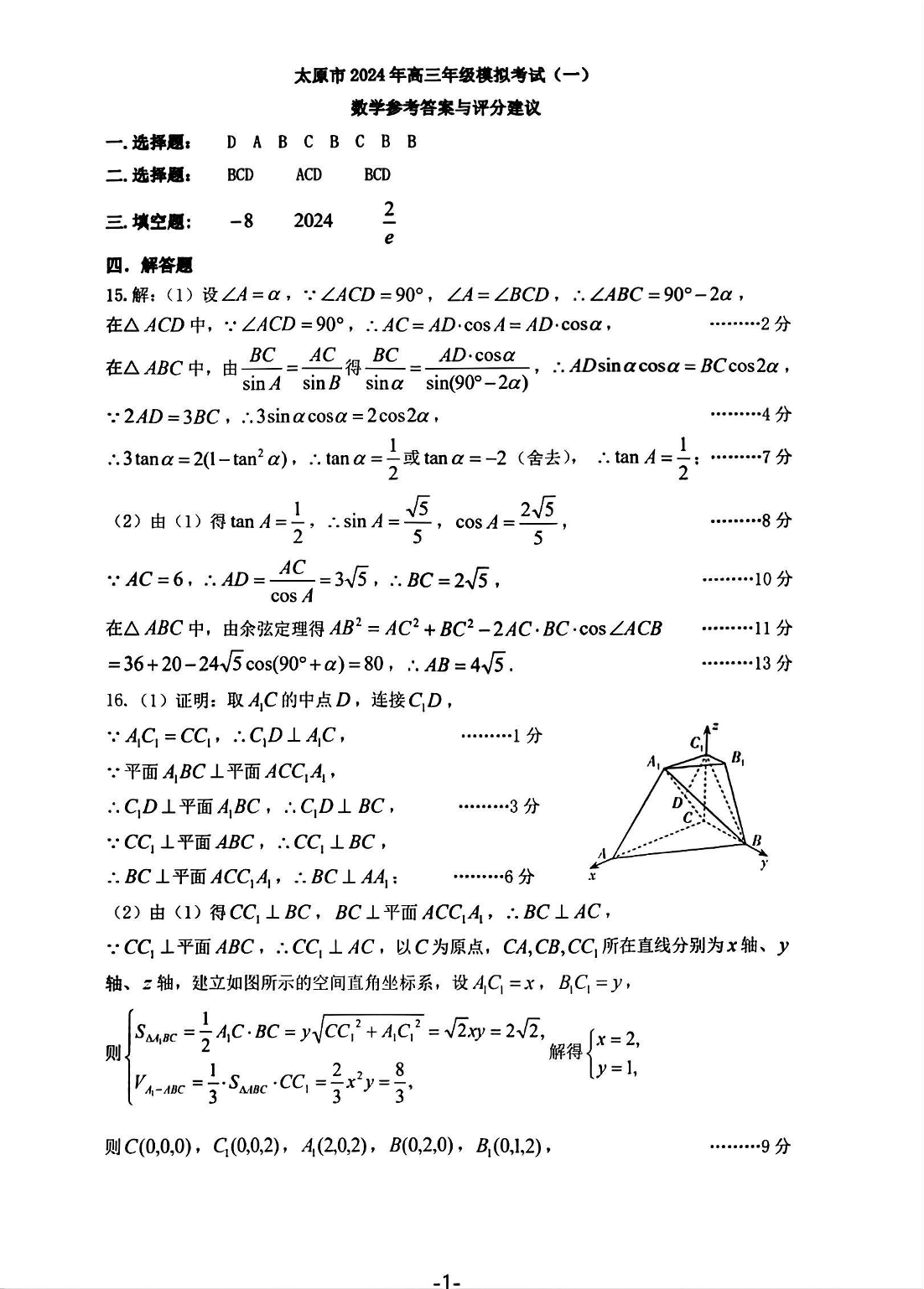 山西省太原市2024届高三下学期模拟考试(一)(太原一模)数学答案