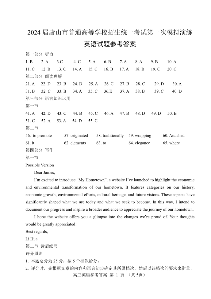 唐山市2024 届普通高中学业水平选择性考试第一次模拟演练(唐山一模)英语答案