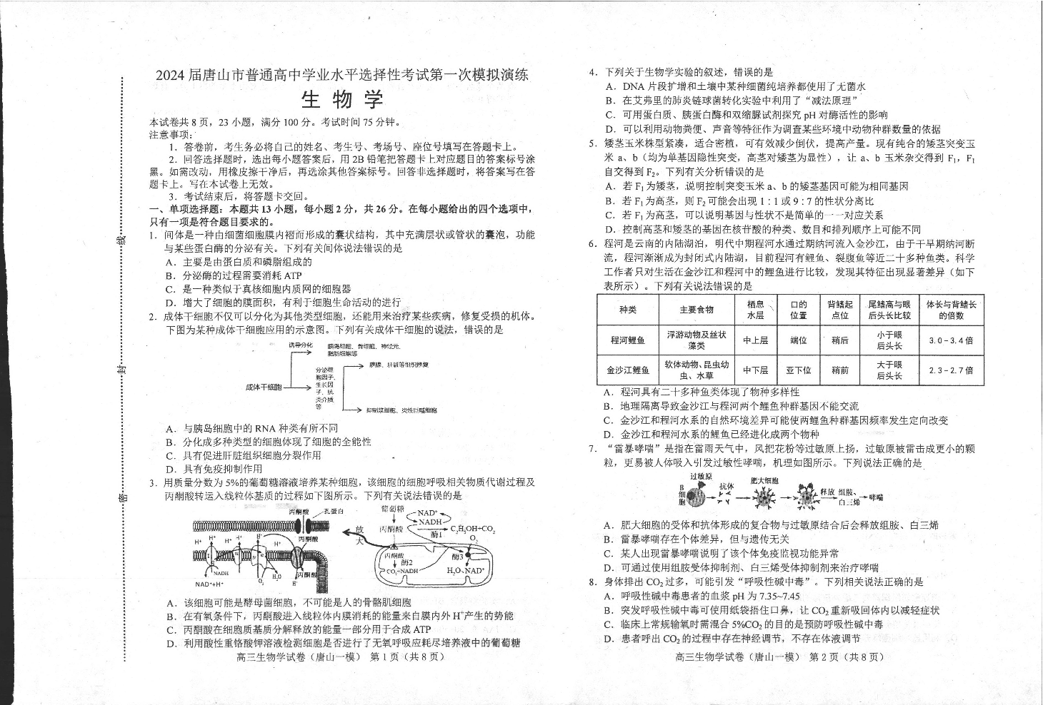 唐山市2024 届普通高中学业水平选择性考试第一次模拟演练(唐山一模)生物