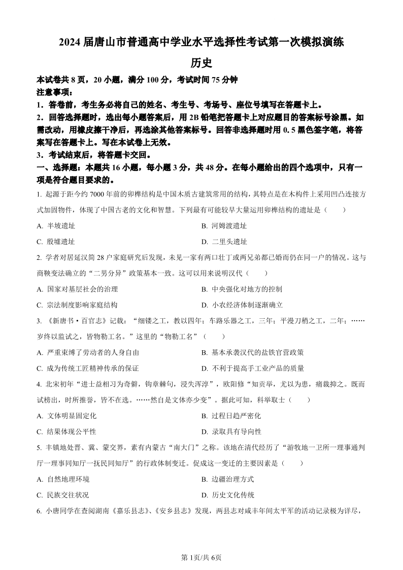唐山市2024 届普通高中学业水平选择性考试第一次模拟演练(唐山一模)历史(原卷版)