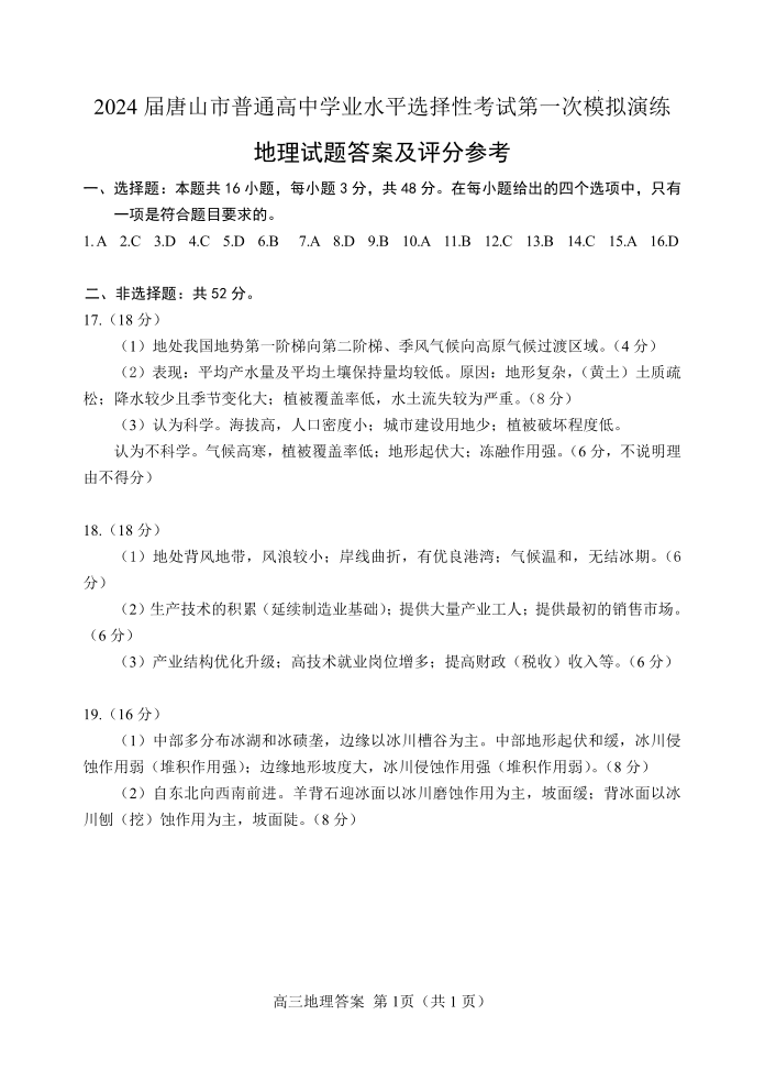 唐山市2024 届普通高中学业水平选择性考试第一次模拟演练(唐山一模)地理答案