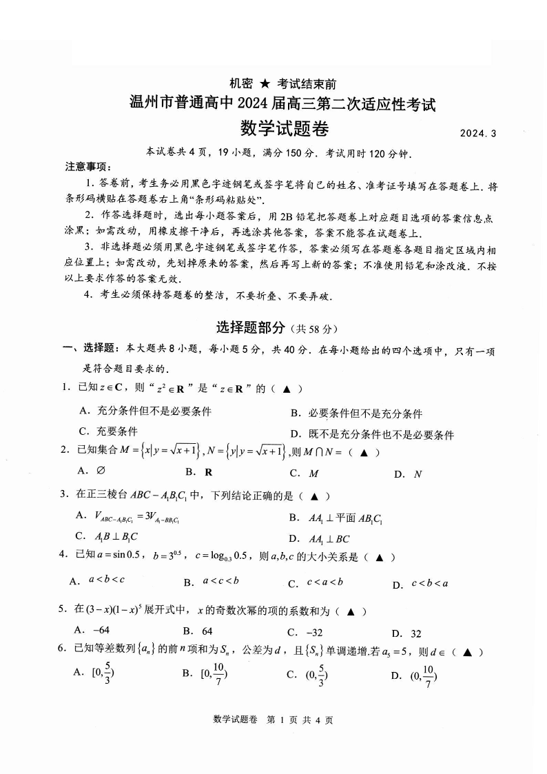 浙江省温州市普通高中2024届高三第二次适应性考试(温州二模)数学