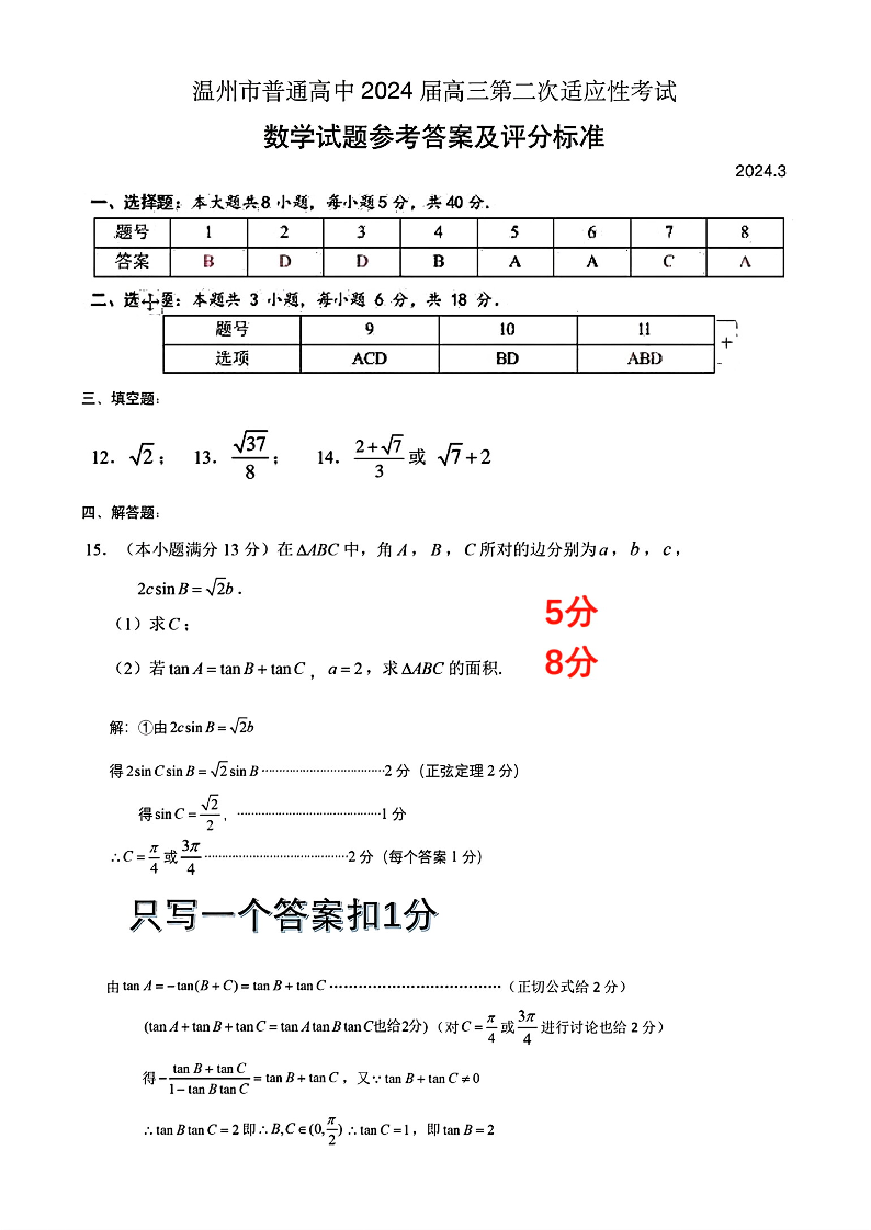 浙江省温州市普通高中2024届高三第二次适应性考试(温州二模)数学答案