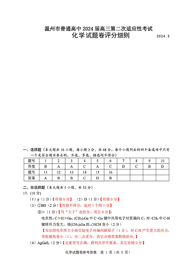 浙江省温州市普通高中2024届高三第二次适应性考试(温州二模)化学答案