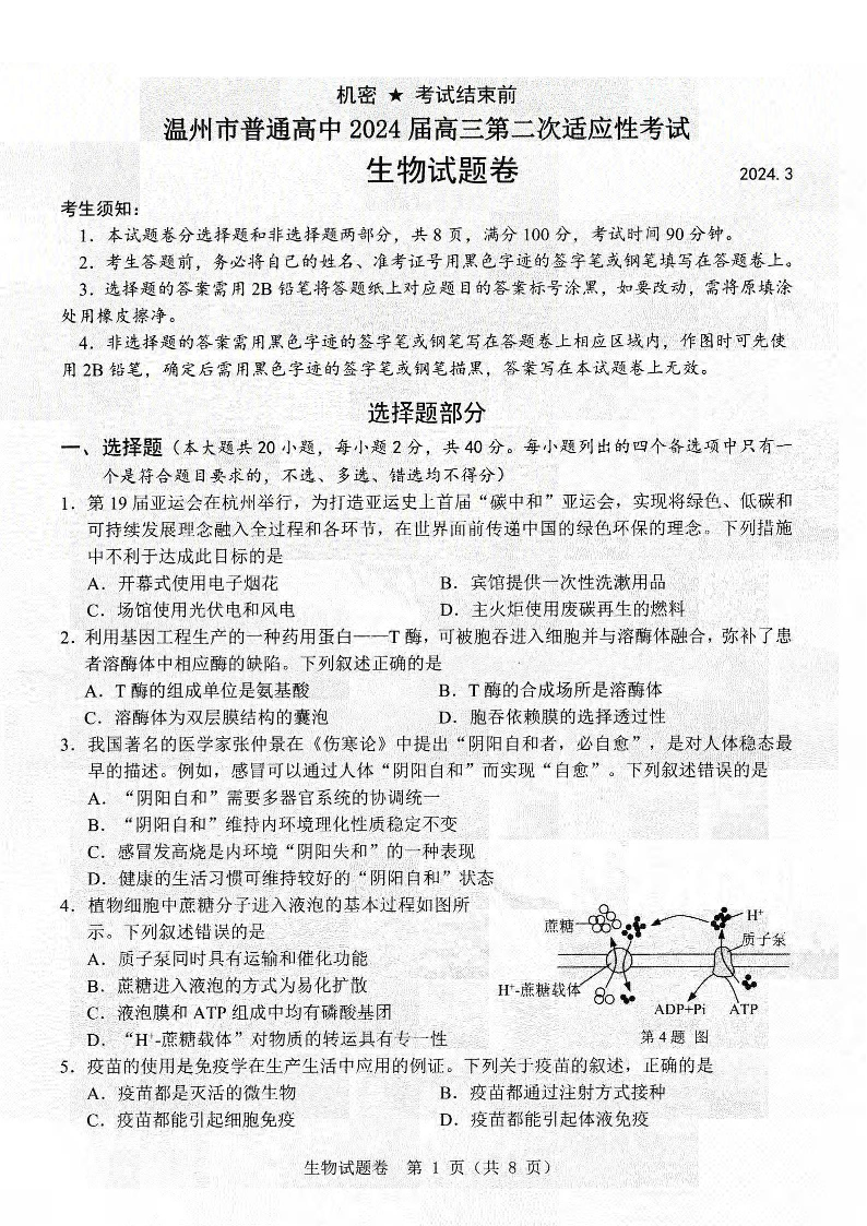 浙江省温州市普通高中2024届高三第二次适应性考试(温州二模)生物