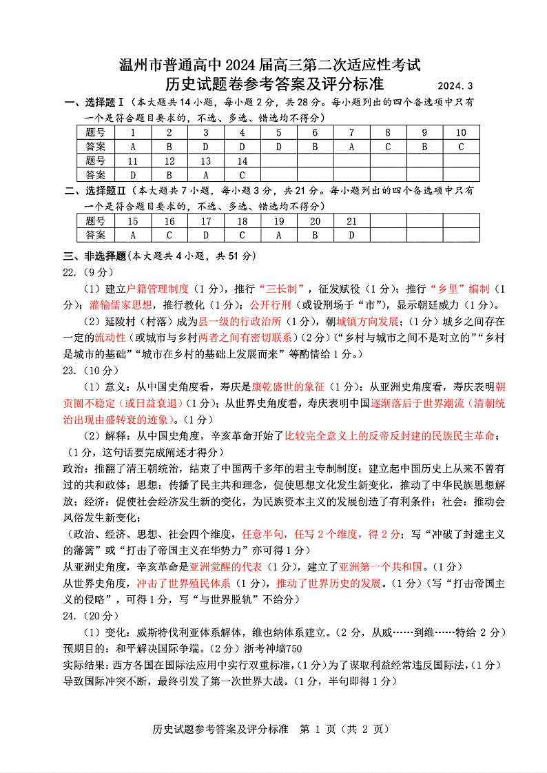 浙江省温州市普通高中2024届高三第二次适应性考试(温州二模)历史答案