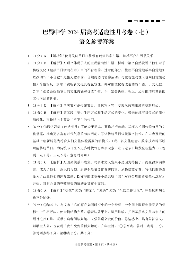 重庆市巴蜀中学2024届高考适应性月考(七)语文答案