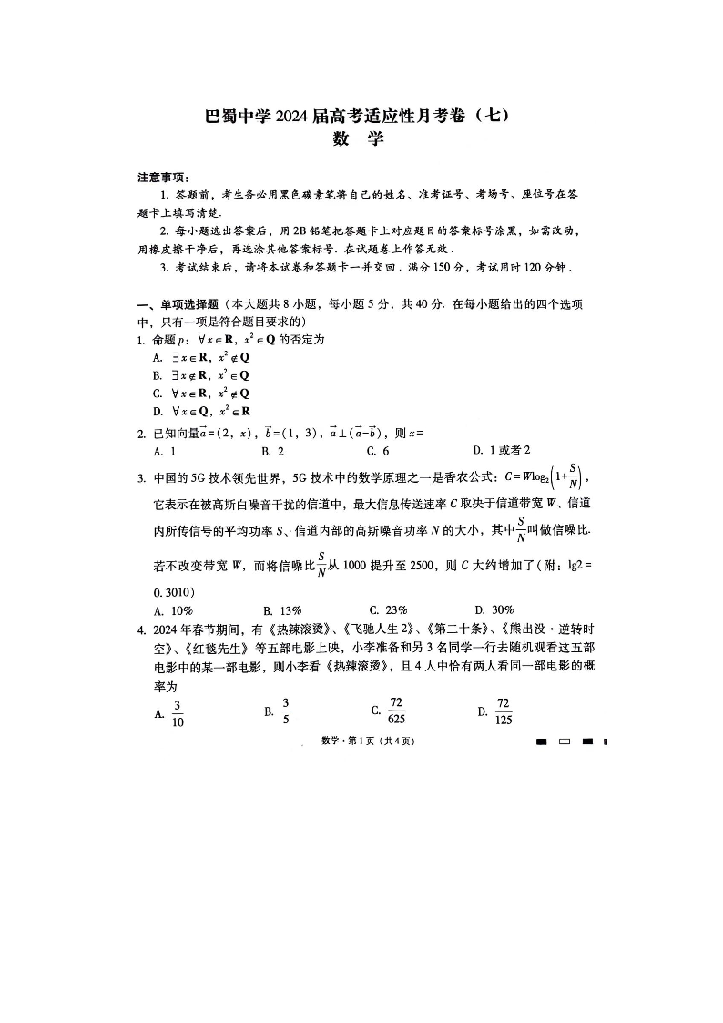 重庆市巴蜀中学2024届高考适应性月考(七)数学