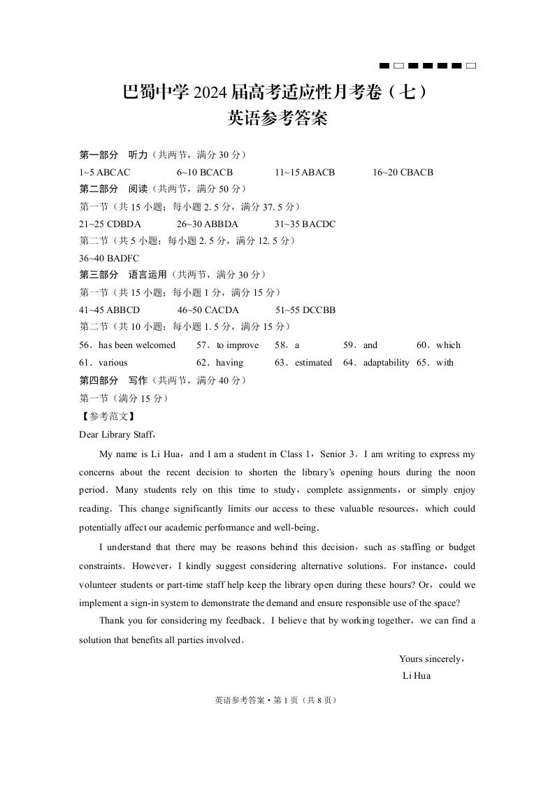 重庆市巴蜀中学2024届高考适应性月考(七)英语答案