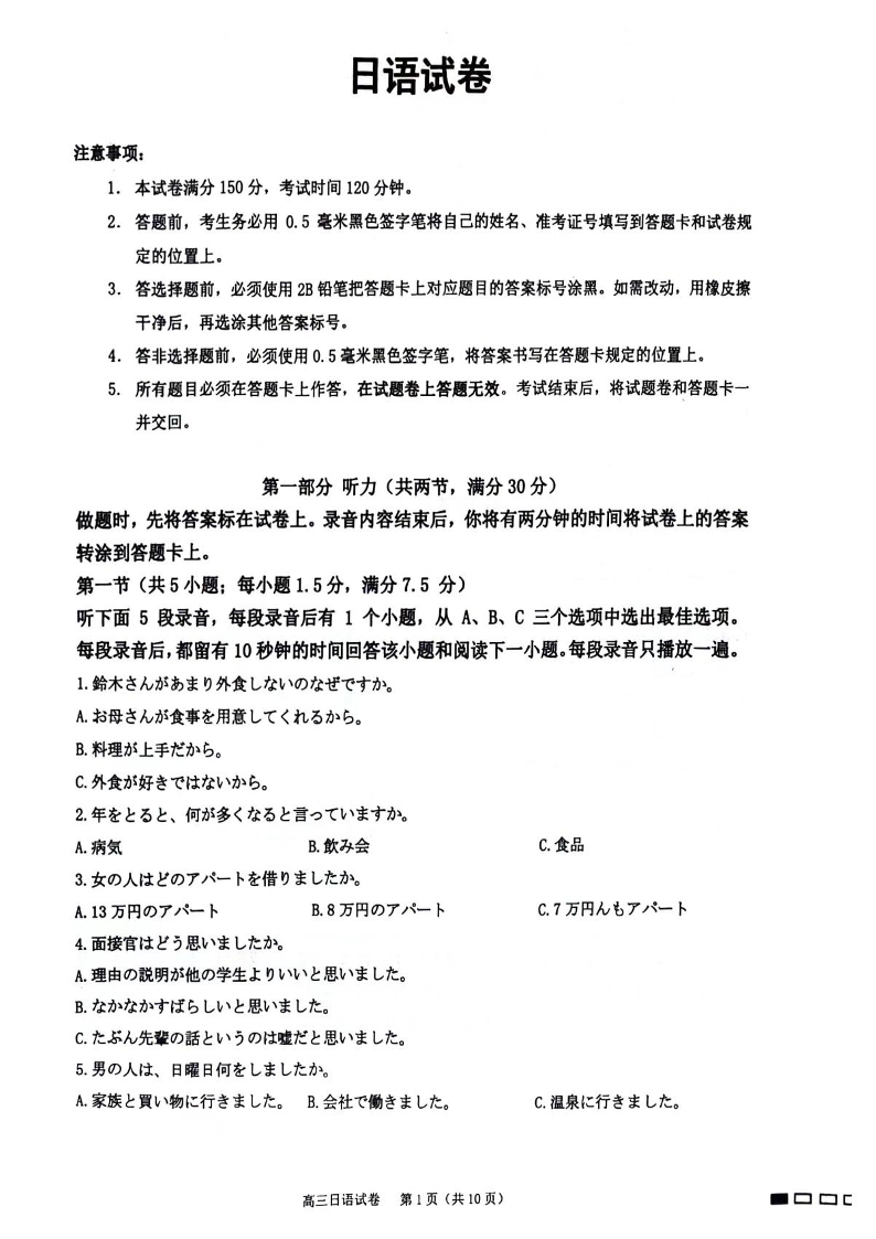 重庆市巴蜀中学2024届高考适应性月考(七)日语