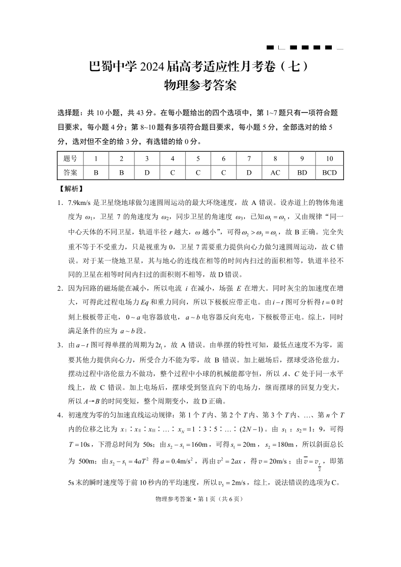 重庆市巴蜀中学2024届高考适应性月考(七)物理答案