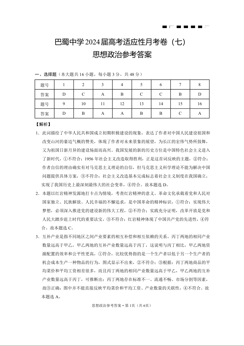 重庆市巴蜀中学2024届高考适应性月考(七)政治答案