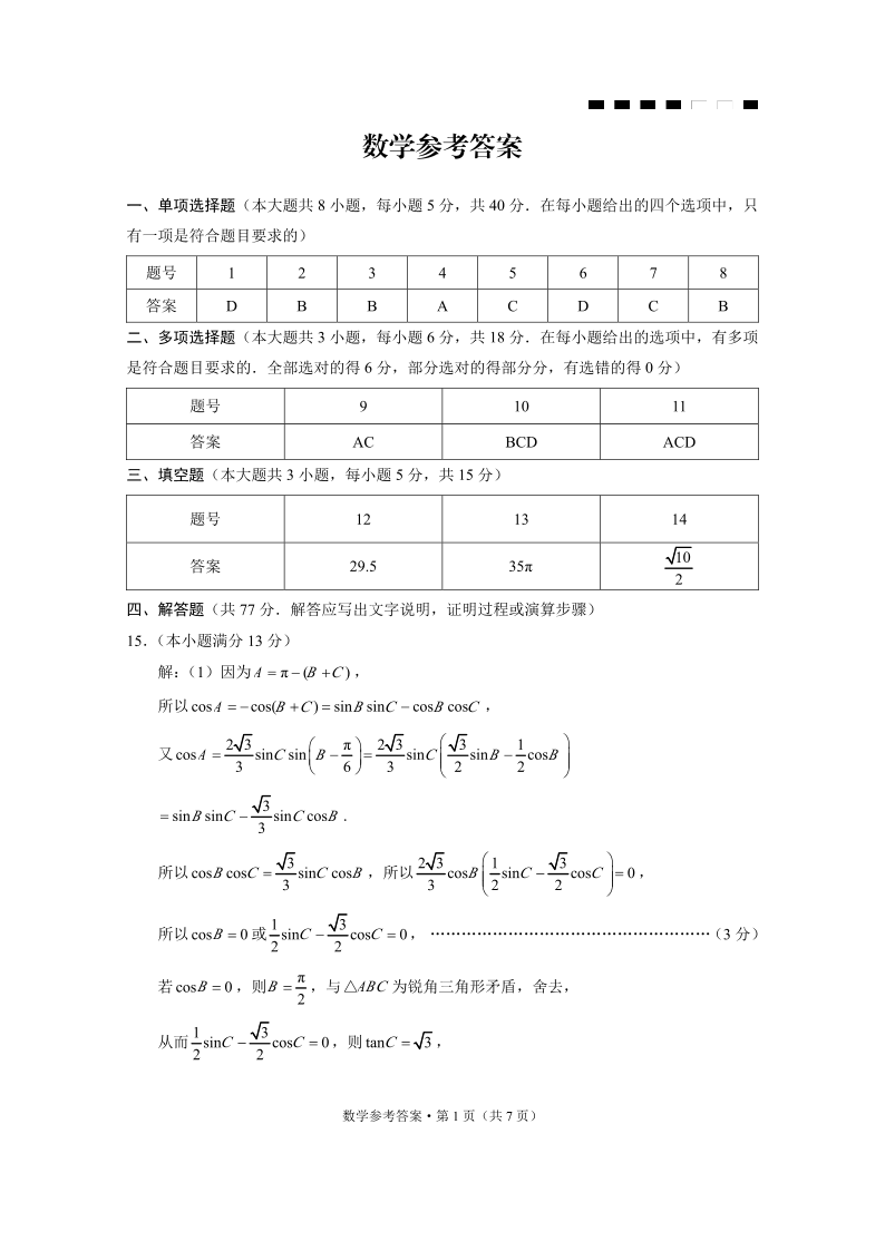 重庆市第八中学2024届高考适应性月考卷(六)数学答案